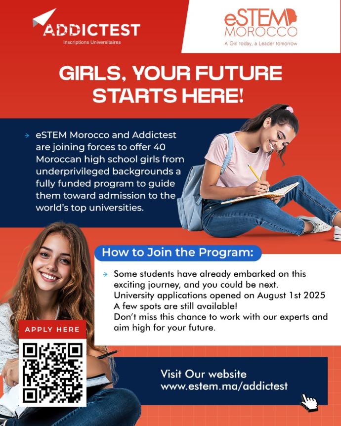 eSTEM Morocco and Addictest partner to empower 40 underprivileged high school girls in Morocco by providing them with a fully funded program designed to help them gain admission to top colleges worldwide. The initiative aims to prepare these outstanding young girls to apply to leading American universities through comprehensive support, including college counseling, SAT preparation classes, and English proficiency test training. By offering these resources, the program seeks to break down barriers and create opportunities for these students to achieve their academic and professional aspirations on a global stage.